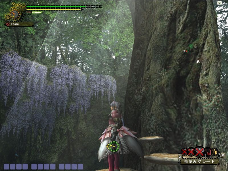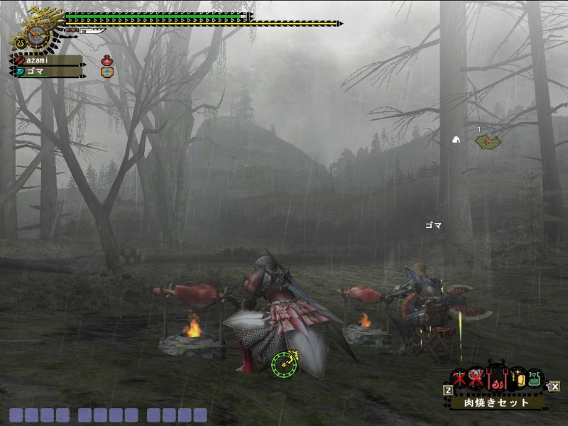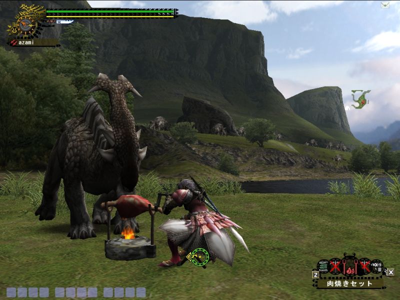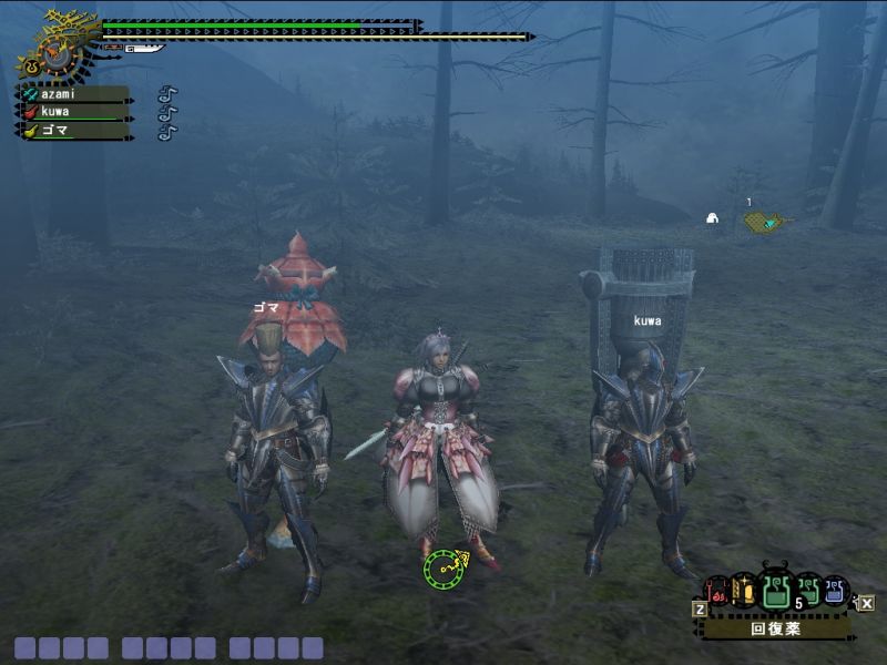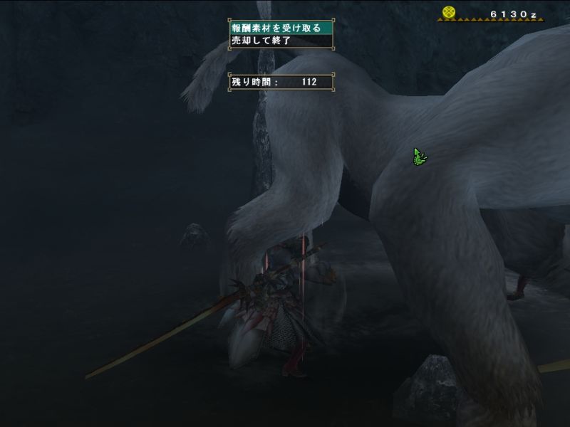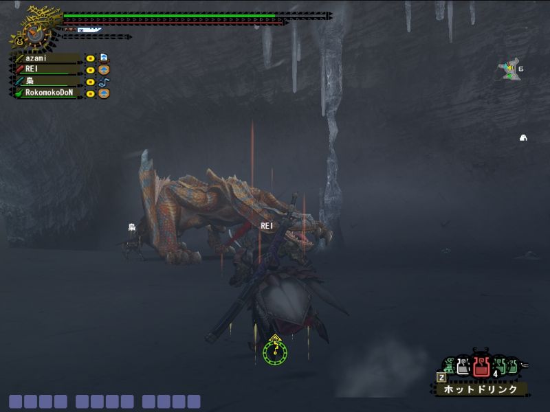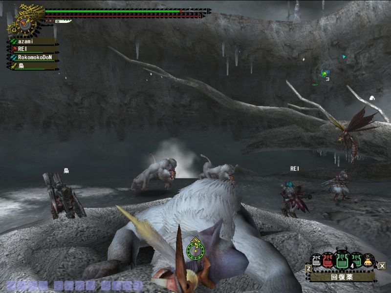 ゴマちゃんともども場所が雪山とは知らず、ホットを忘れるという大失態でスタミナとられまくり。加えて双剣だったのでキョウソウGが切れたあとはへろへろ。。。回復も飲み尽くして体力もスタミナも赤ゲージ